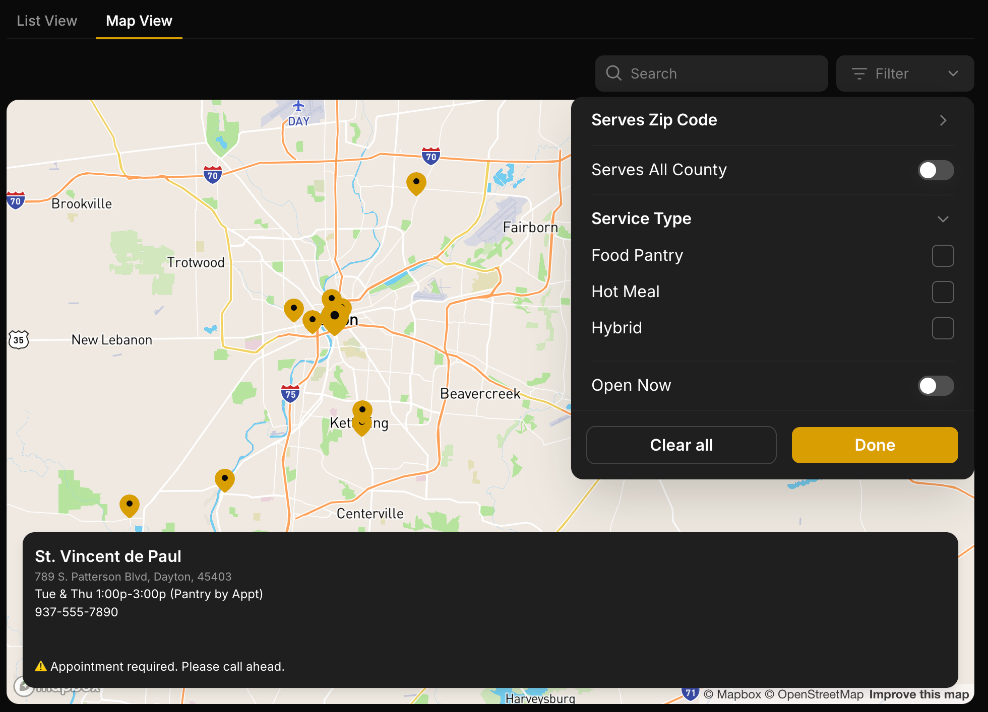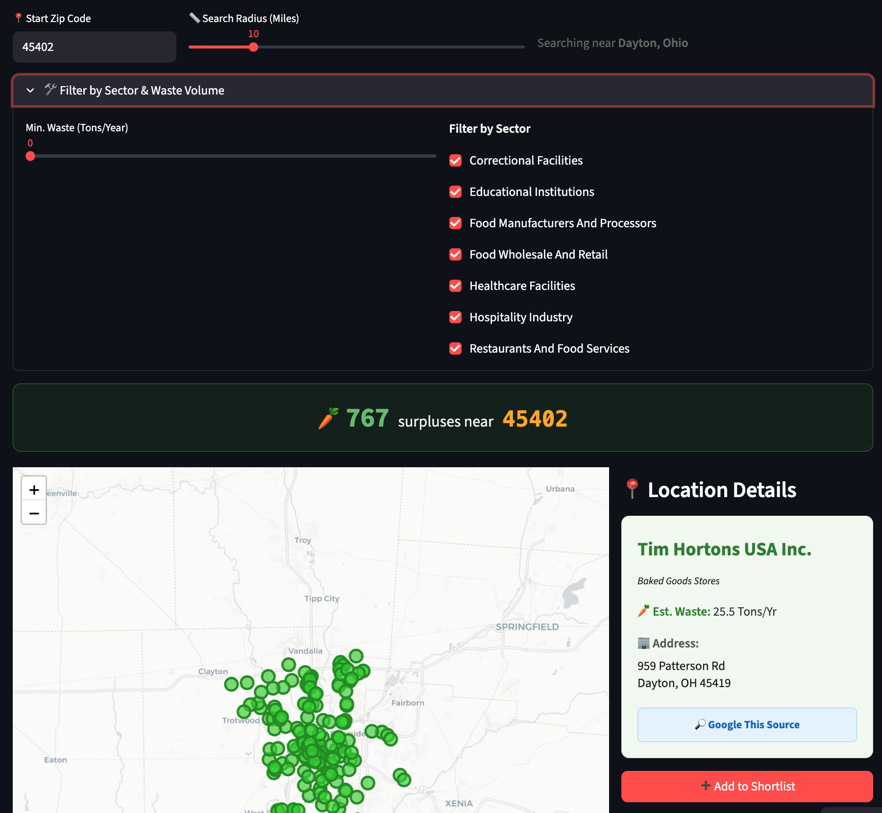 Surplus Food Scout is a custom-built digital application that leverages EPA data to visualize potential food donation partners. Currently being piloted by Miami Valley Meals to streamline their food rescue operations.